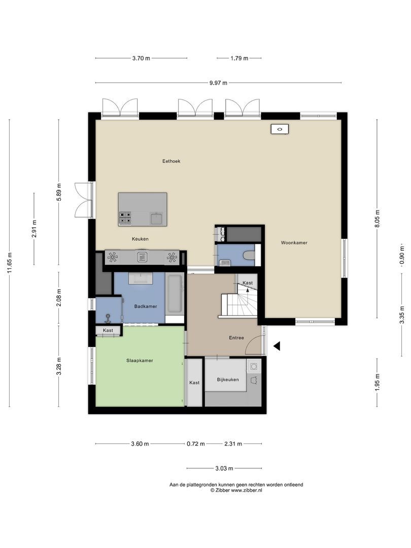Toegangsdeur naar woongedeelte opgesplitst in ruime keuken met kookeiland en inbouwapparatuur, eethoek met zicht op water en woon/zitgedeelte met fraaie houthaard. Ruime slaapkamer met inbouwkasten en badkamer en-suite (ligbad, douche, wastafelmeubel). Gastentoilet, trappenhuis naar verdieping, ruime woonkamer met houthaard. Openslaande deuren naar terras aan de langsgevel. Op de begane grond shutters voor de ramen.