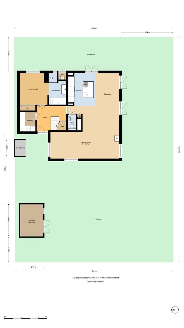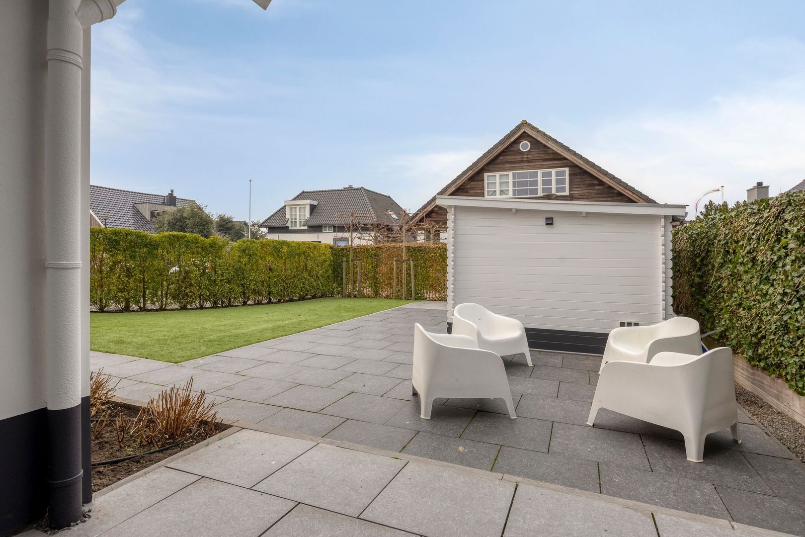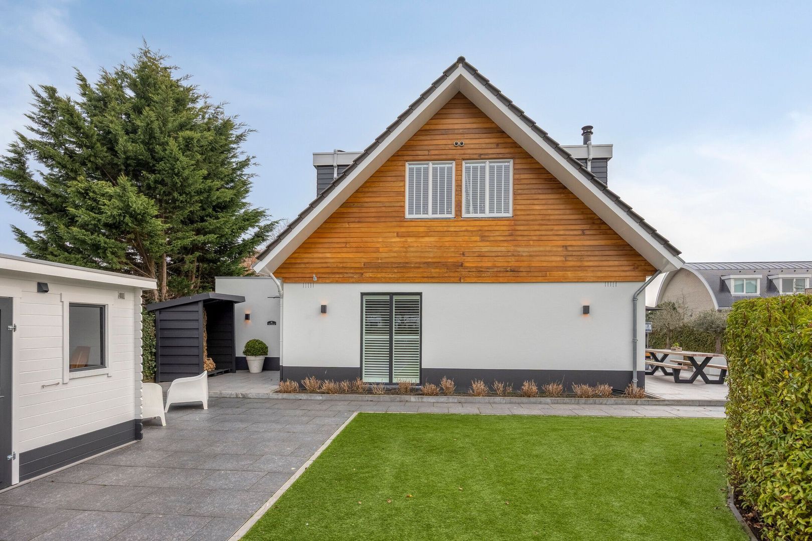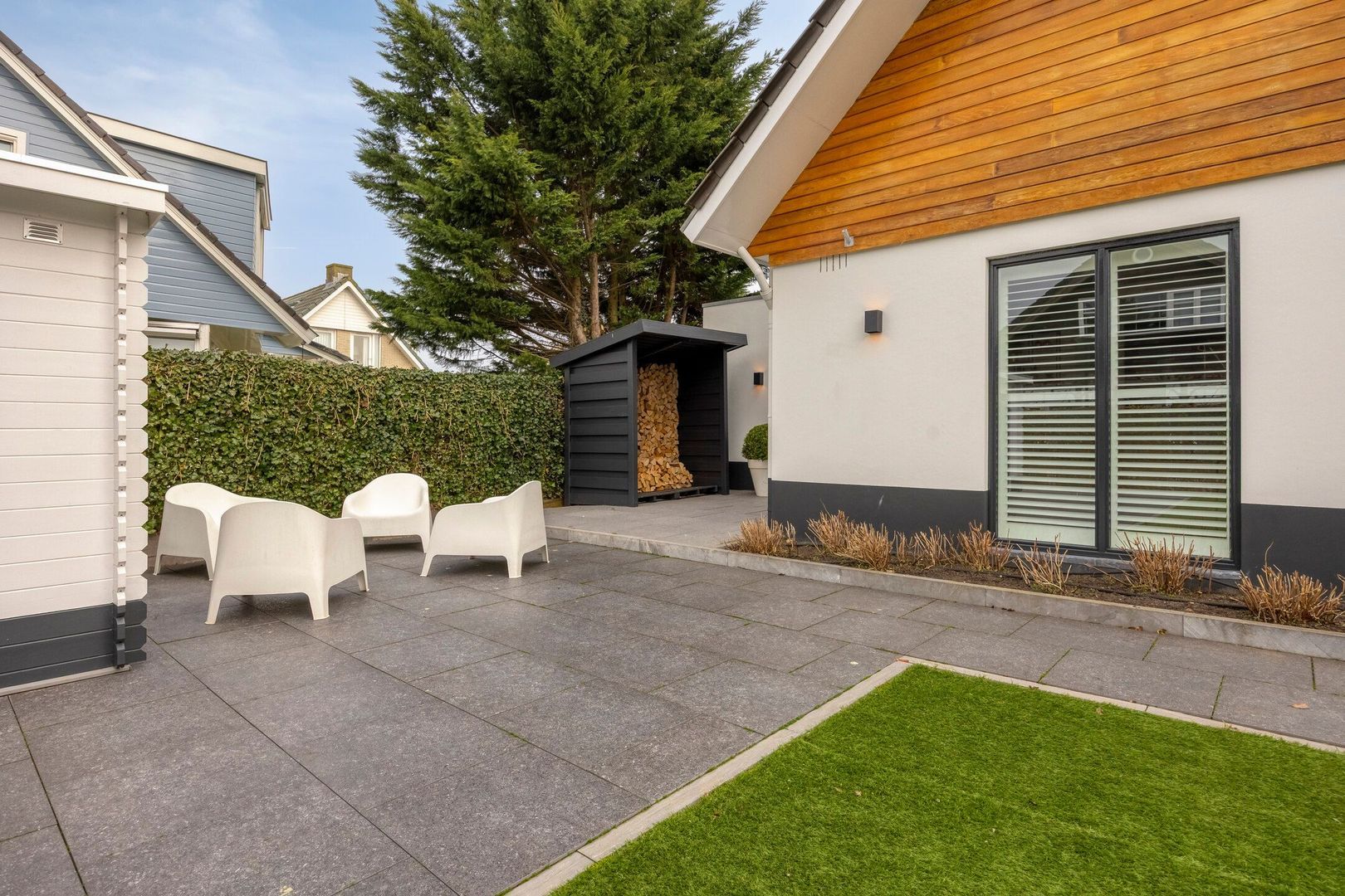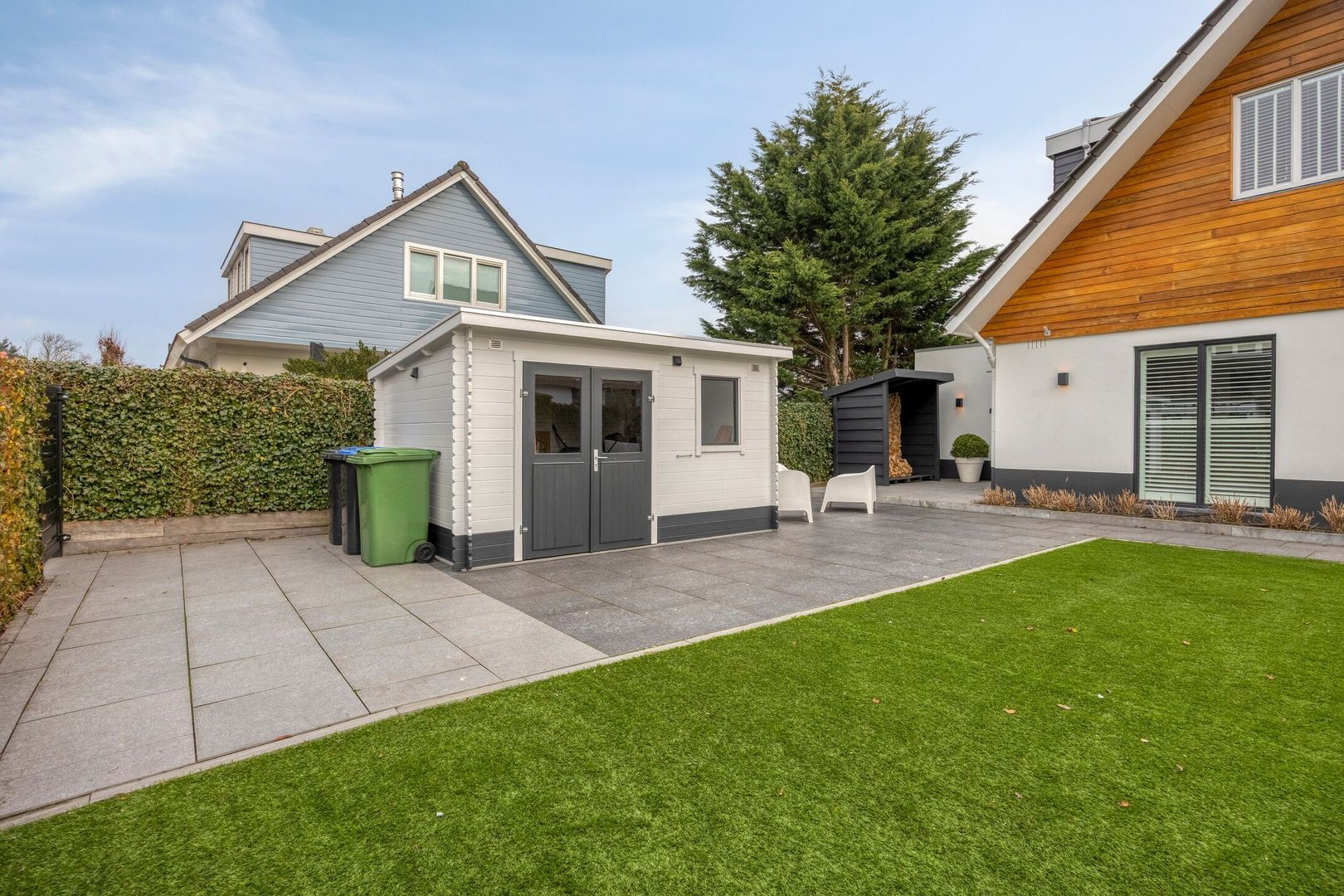 In de tuin bevinden zich een houten berging met dubbele deuren en een overkapping voor houtopslag. Diverse wateraansluitingen alsmede stopcontacten geintegreerd in de tuin.