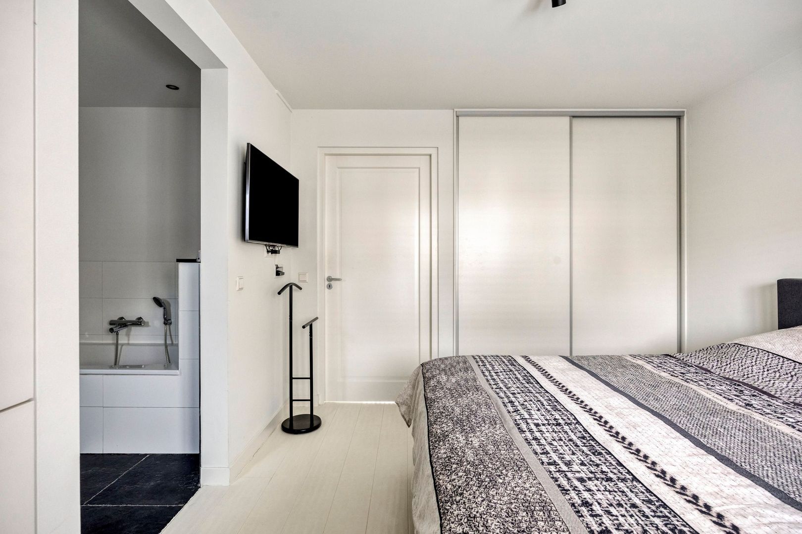 Entree, ruime hal, meterkast, trappenhuis, bergkast en bijkeuken met was- en droogcombinatie. Deur naar ruime slaapkamer met luxe uitgevoerde en-suite badkamer.