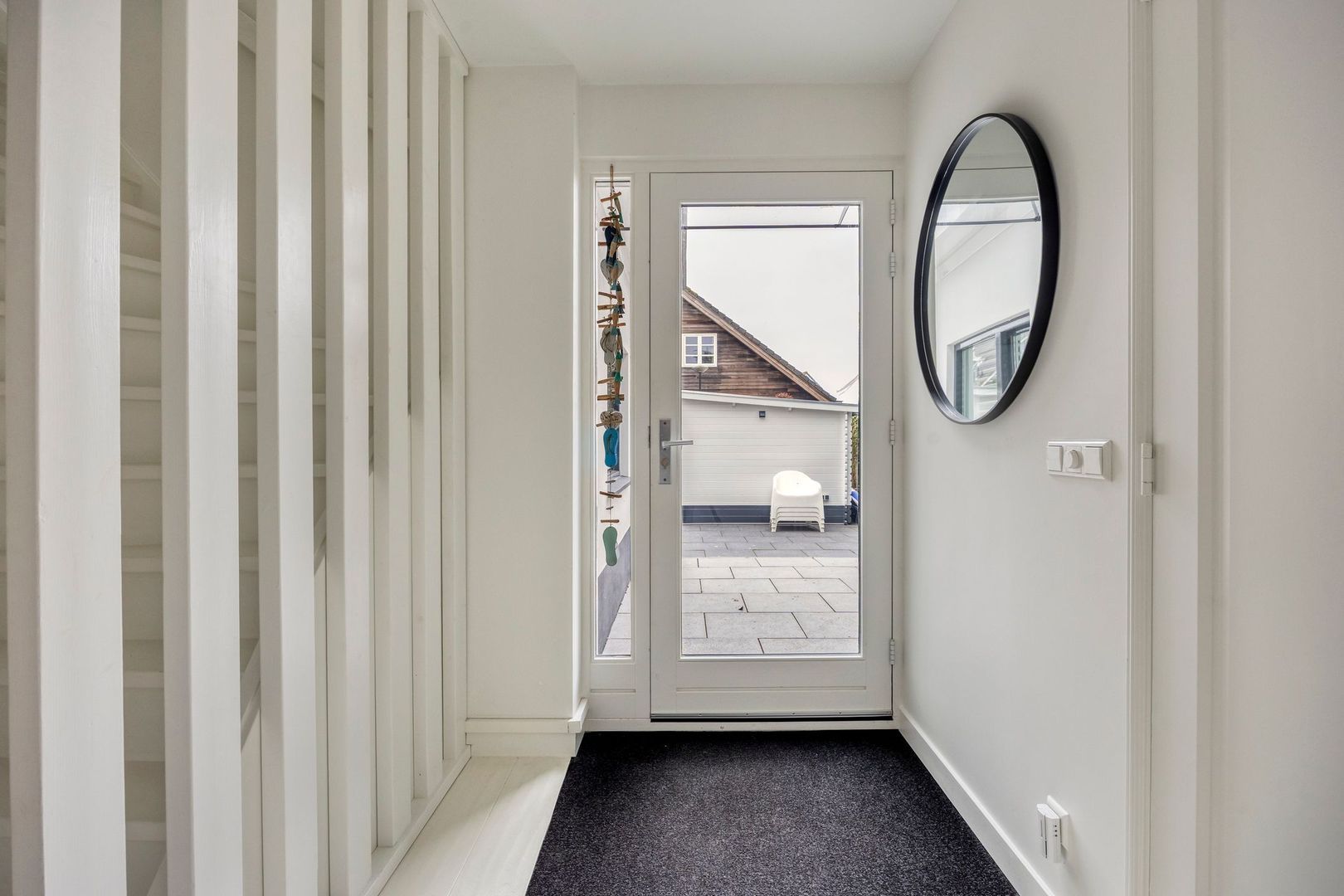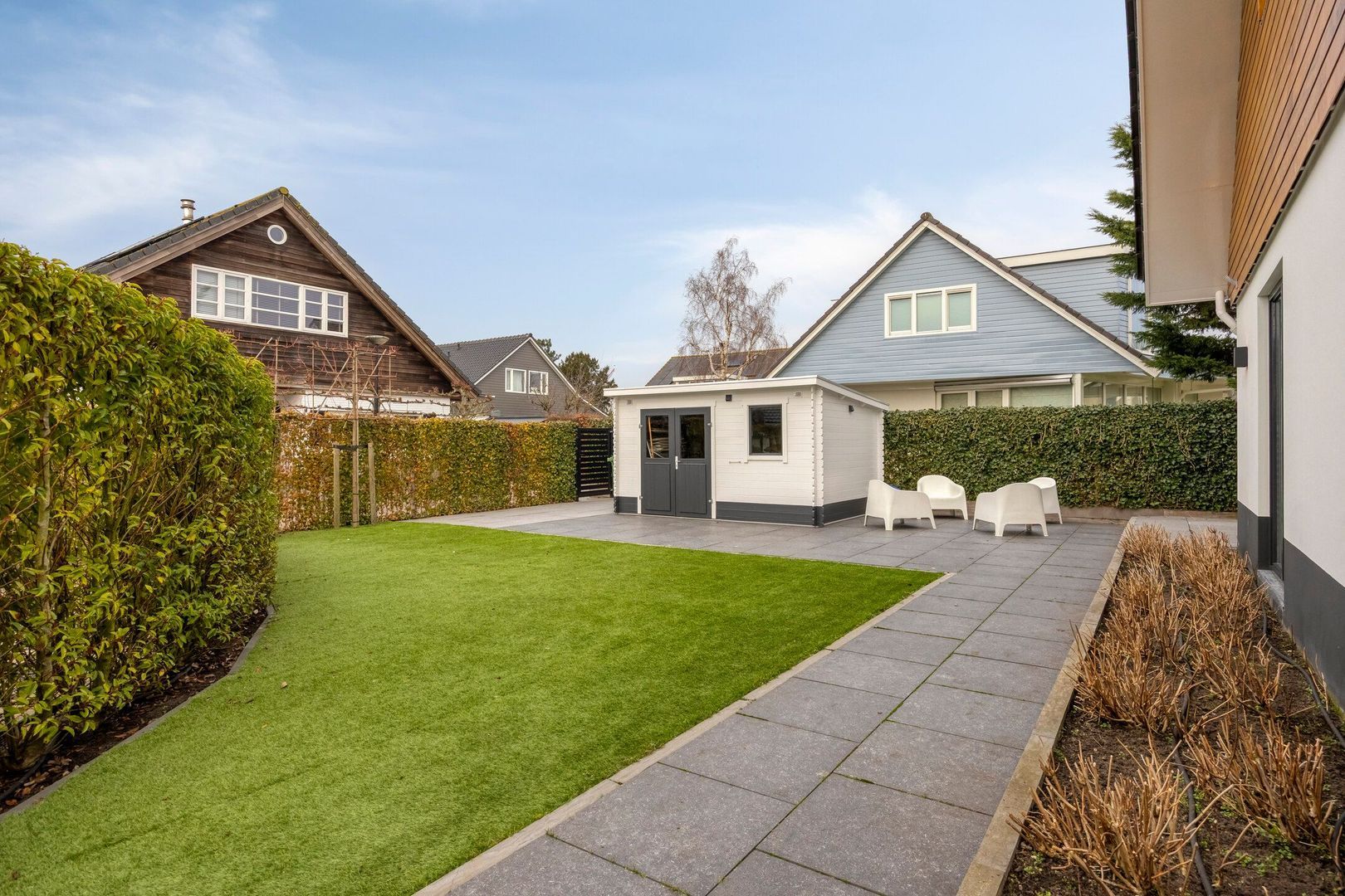 Tuin volledig omheind. Parkeerplaatsen op verhard terrein voor meerdere auto's. Tevens parkeren op de openbare weg voor de woning. Laadpaal voor elektrische auto.