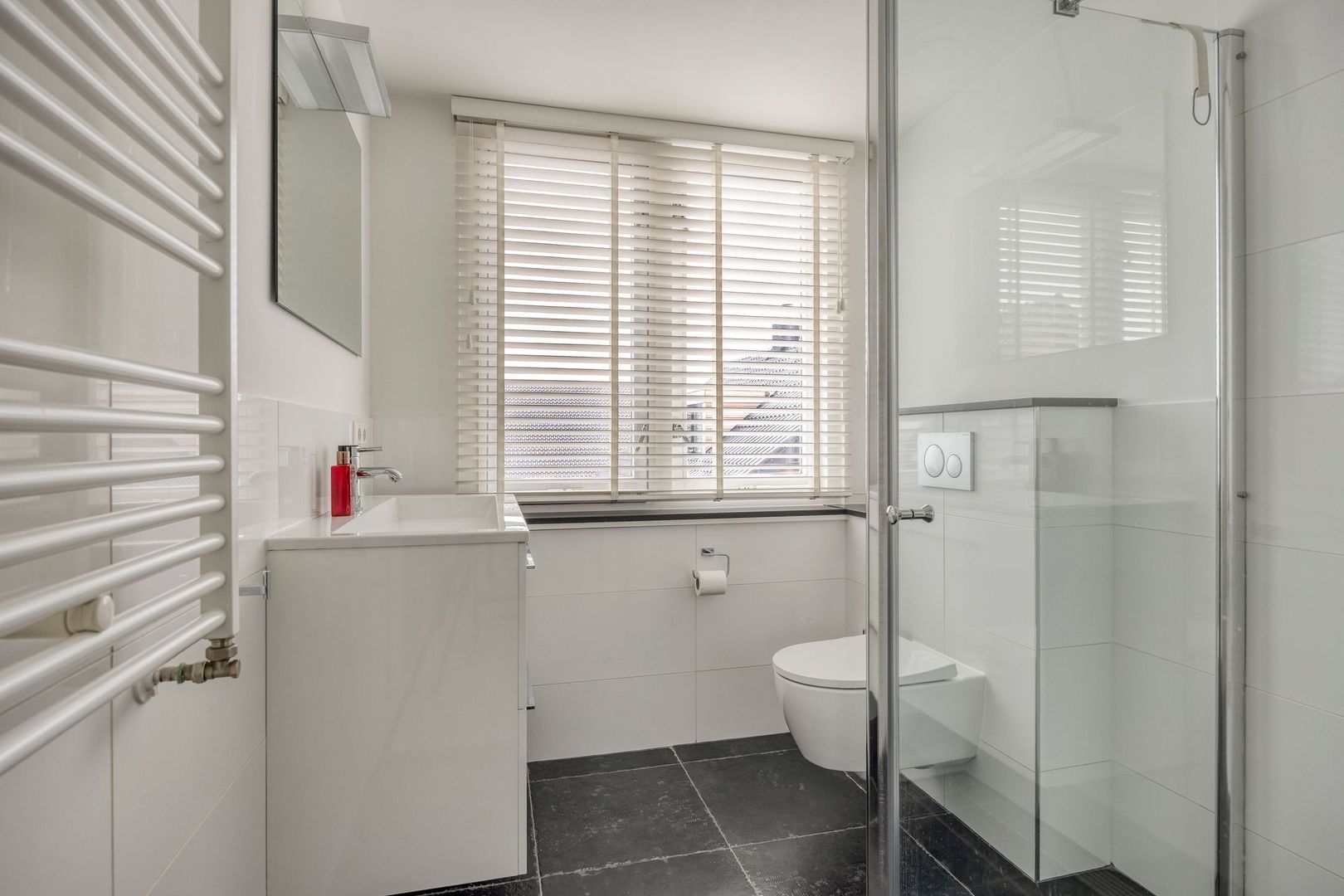 Ruime overloop met entree naar badkamer met wastafel, toilet en douche.