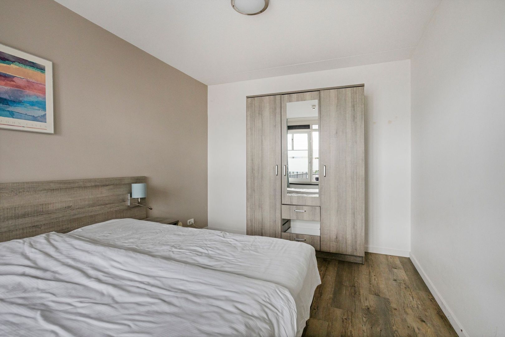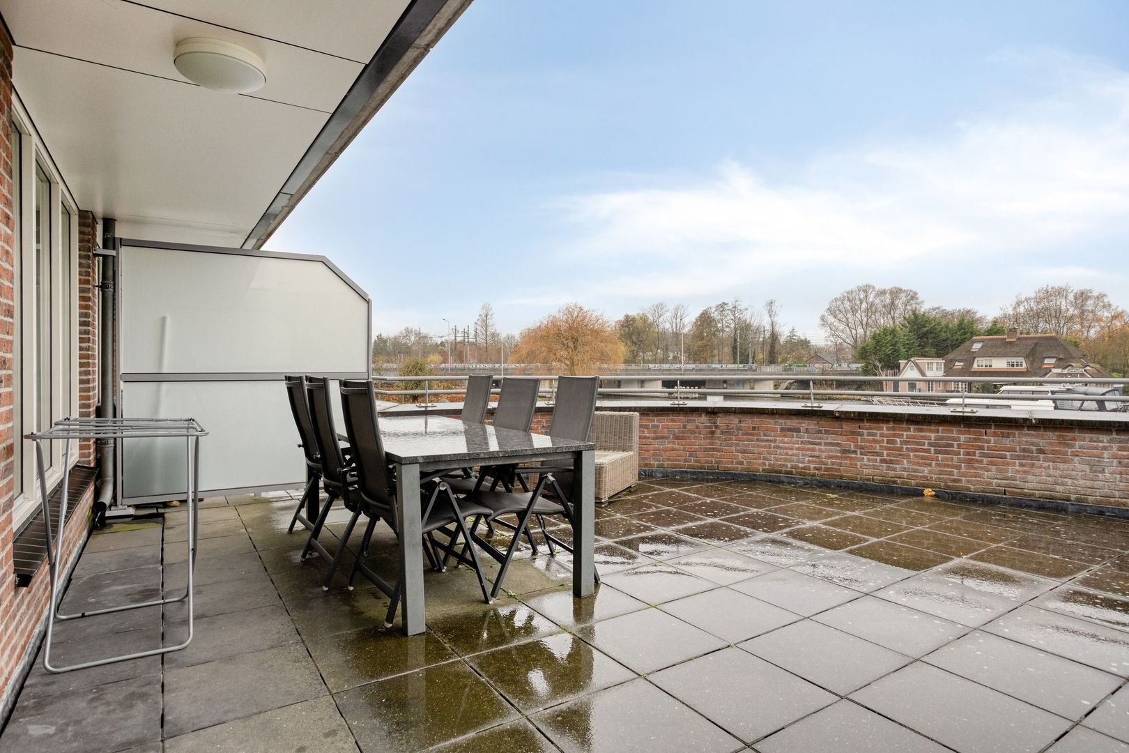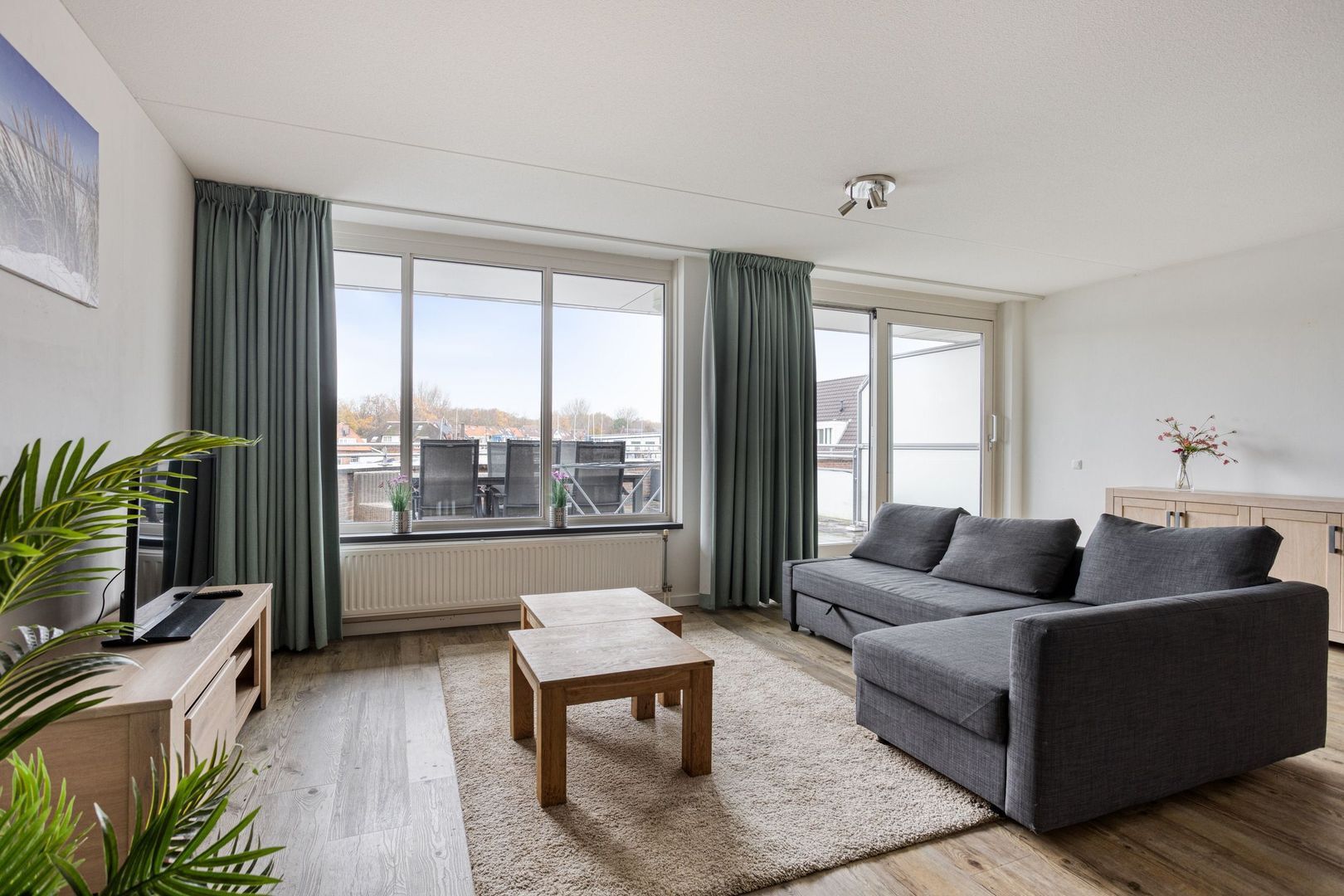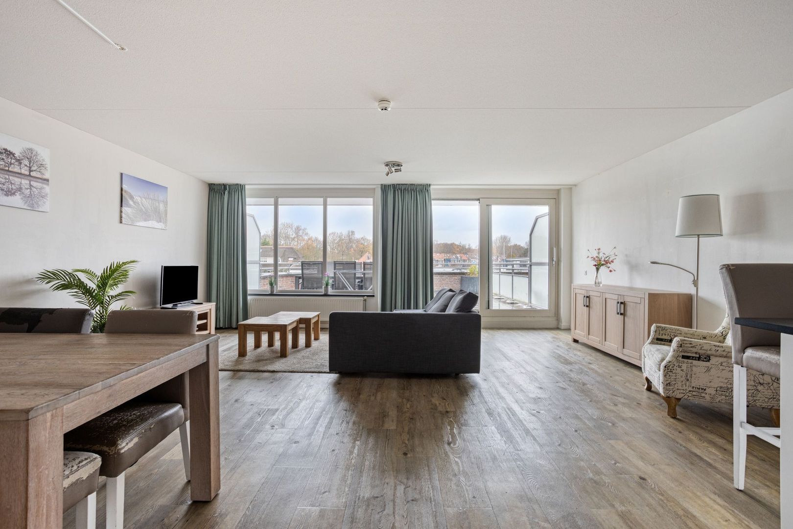 Het appartement kijkt uit op de jachthaven en de Leede. Aan deze zijde bevindt zich een groot dakterras. Het appartement telt drie kamers, waarvan twee slaapkamers.