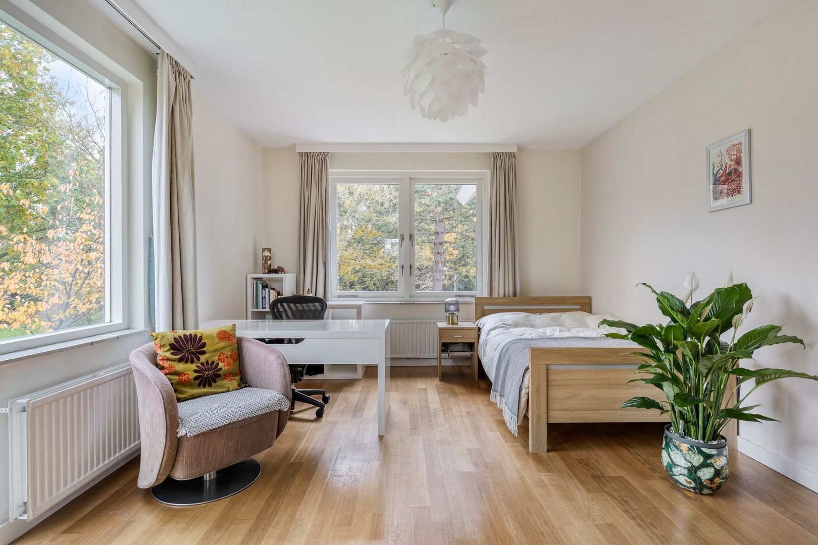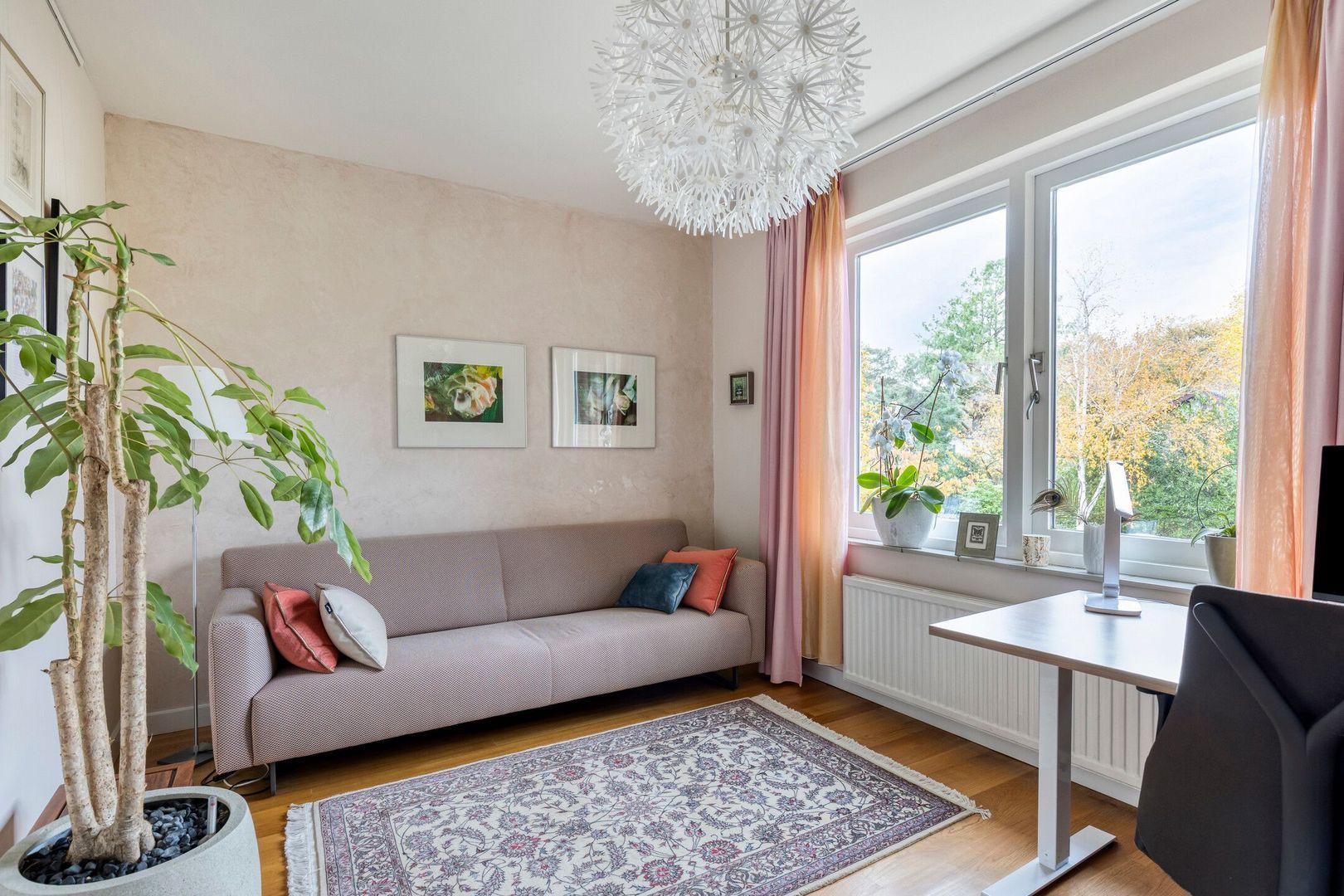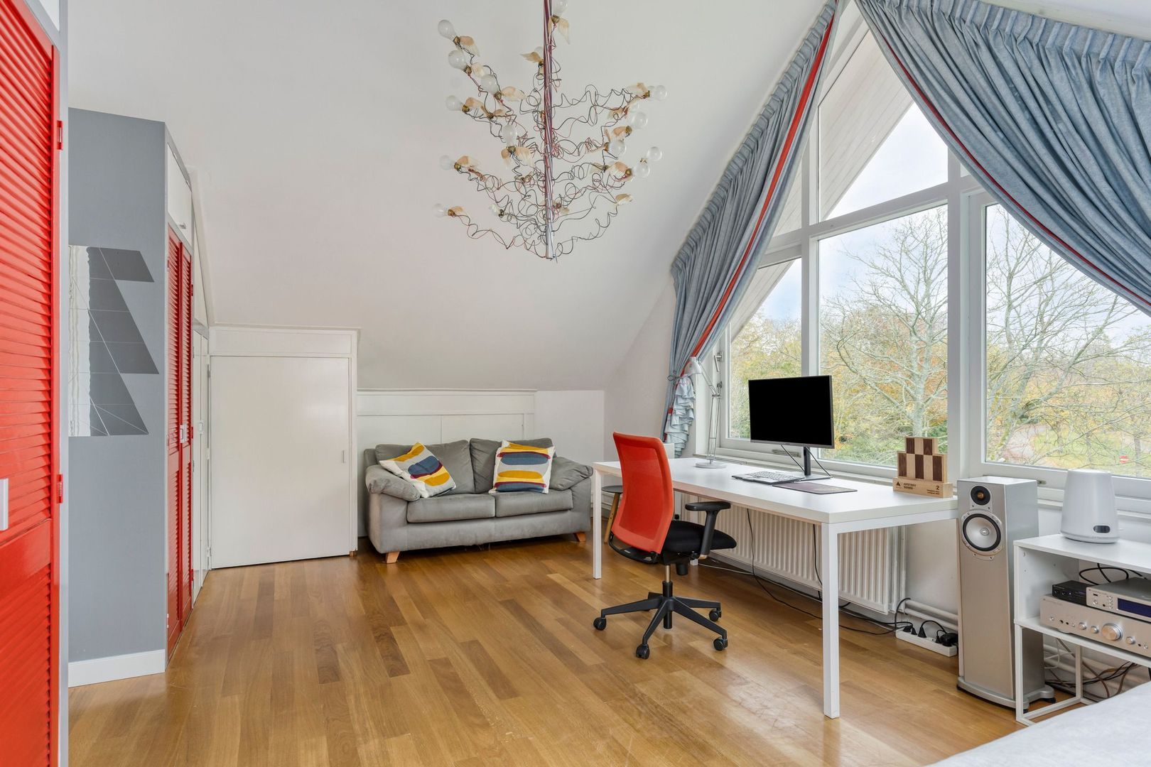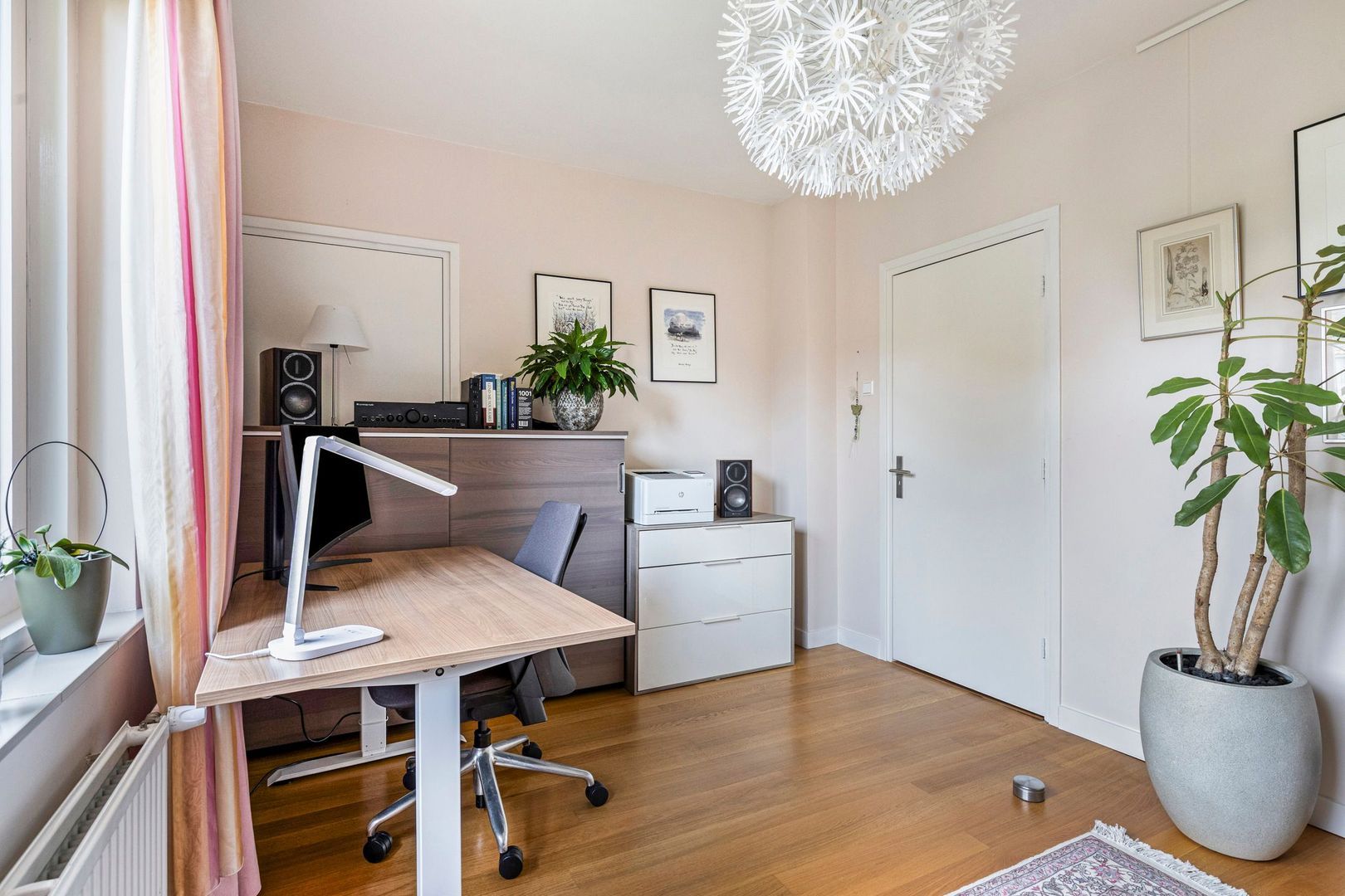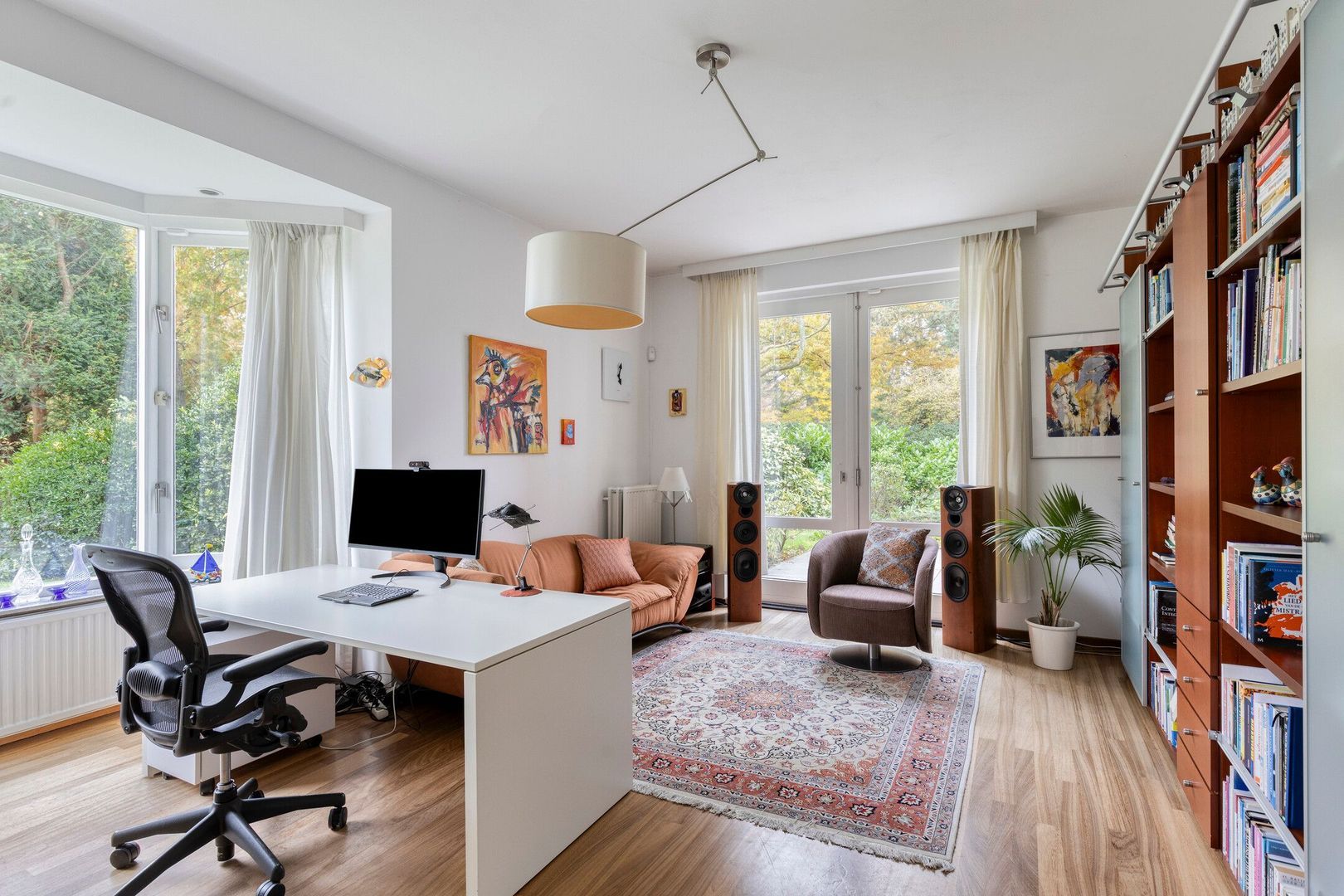 Studeer-/werkkamer met zicht op zijtuin (Julianawegzijde), openslaande deuren naar een terras, lichte parketvloer en aan twee zijden lichtinval.