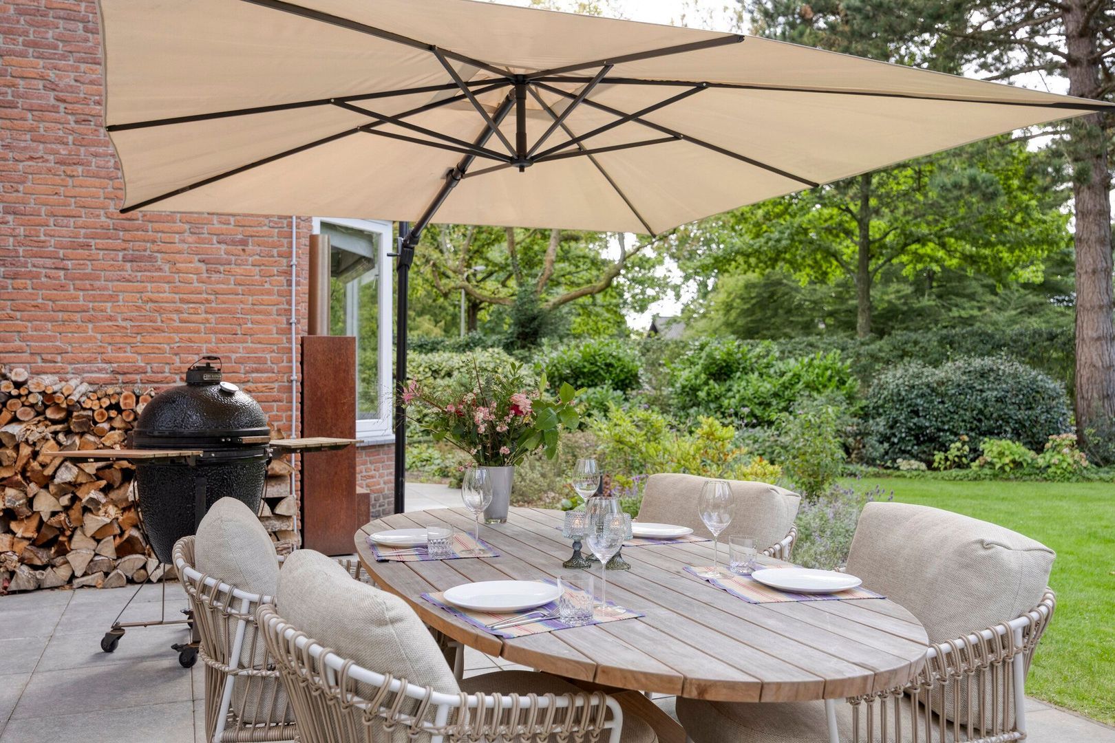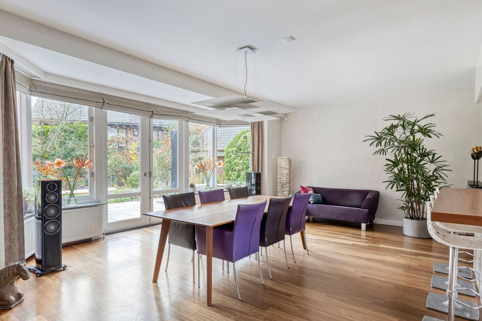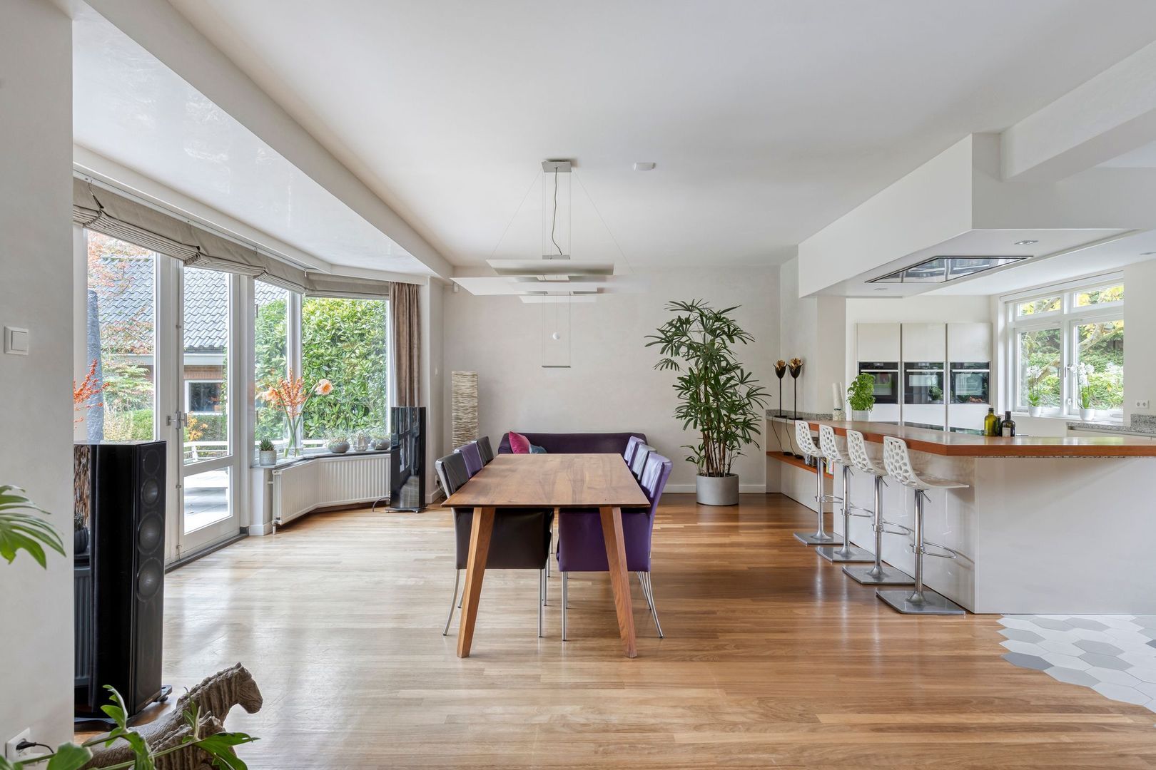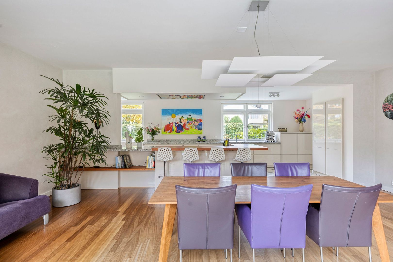 Ruim eetgedeelte met grote tafel, in verbinding met het grote terras middels openslaande deuren.
