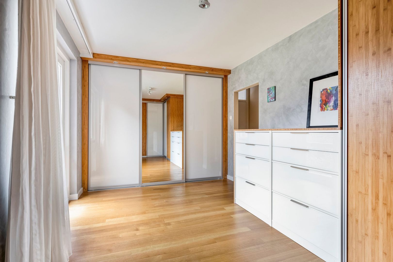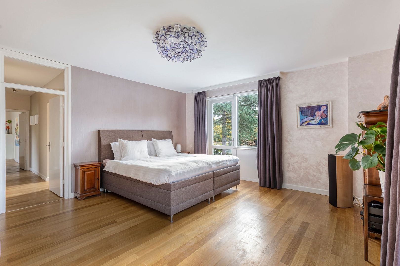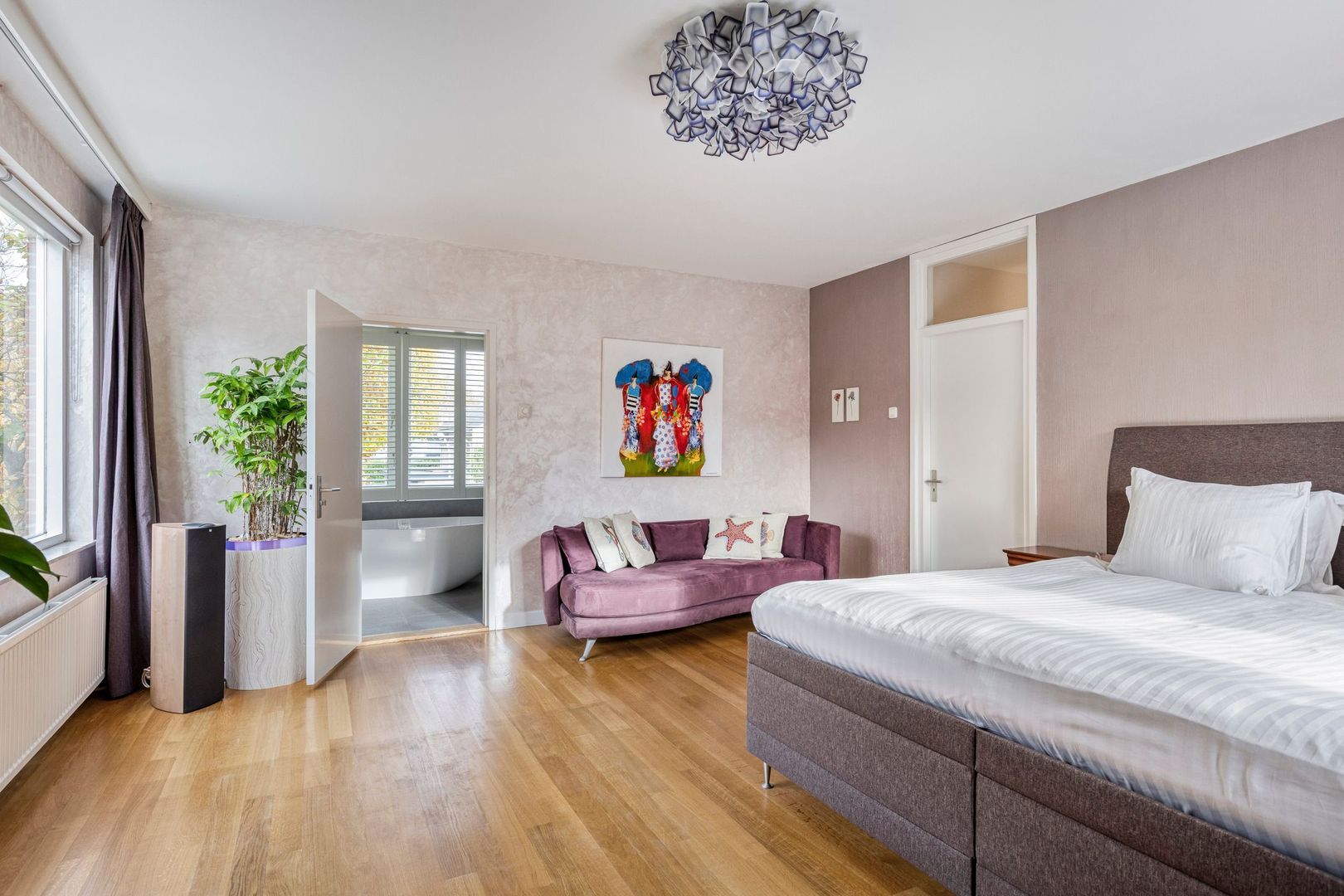 Mastersuite met hoofdslaapkamer: driezijdige lichtval, balkon met zicht op achtertuin, badkamer en suite met wastafelmeubel, ligbad, inloopdouche, toilet en louvredeuren voor de ramen, en een kleedkamer met inbouwkasten.