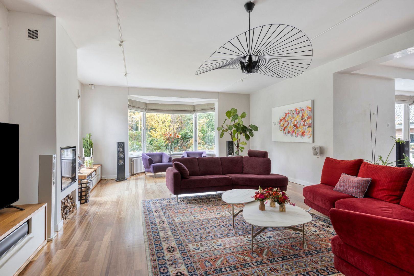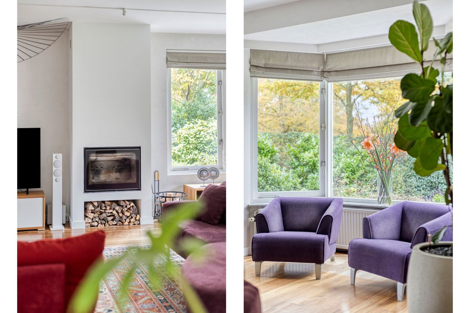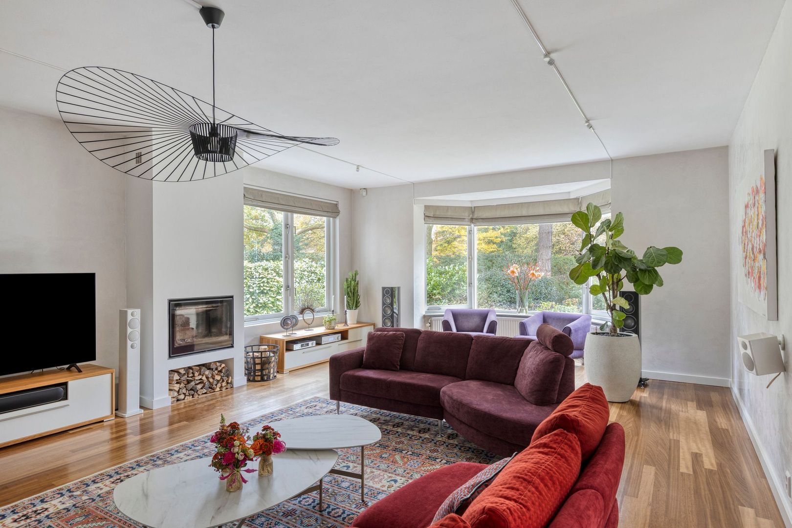 Royale woonkamer met zitgedeelte, gezellige houthaard in open verbinding en doorkijk met de woonkeuken. Zicht op tuin en terrassen vanuit de erker.