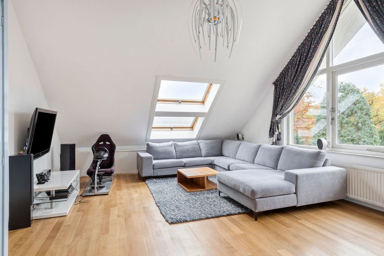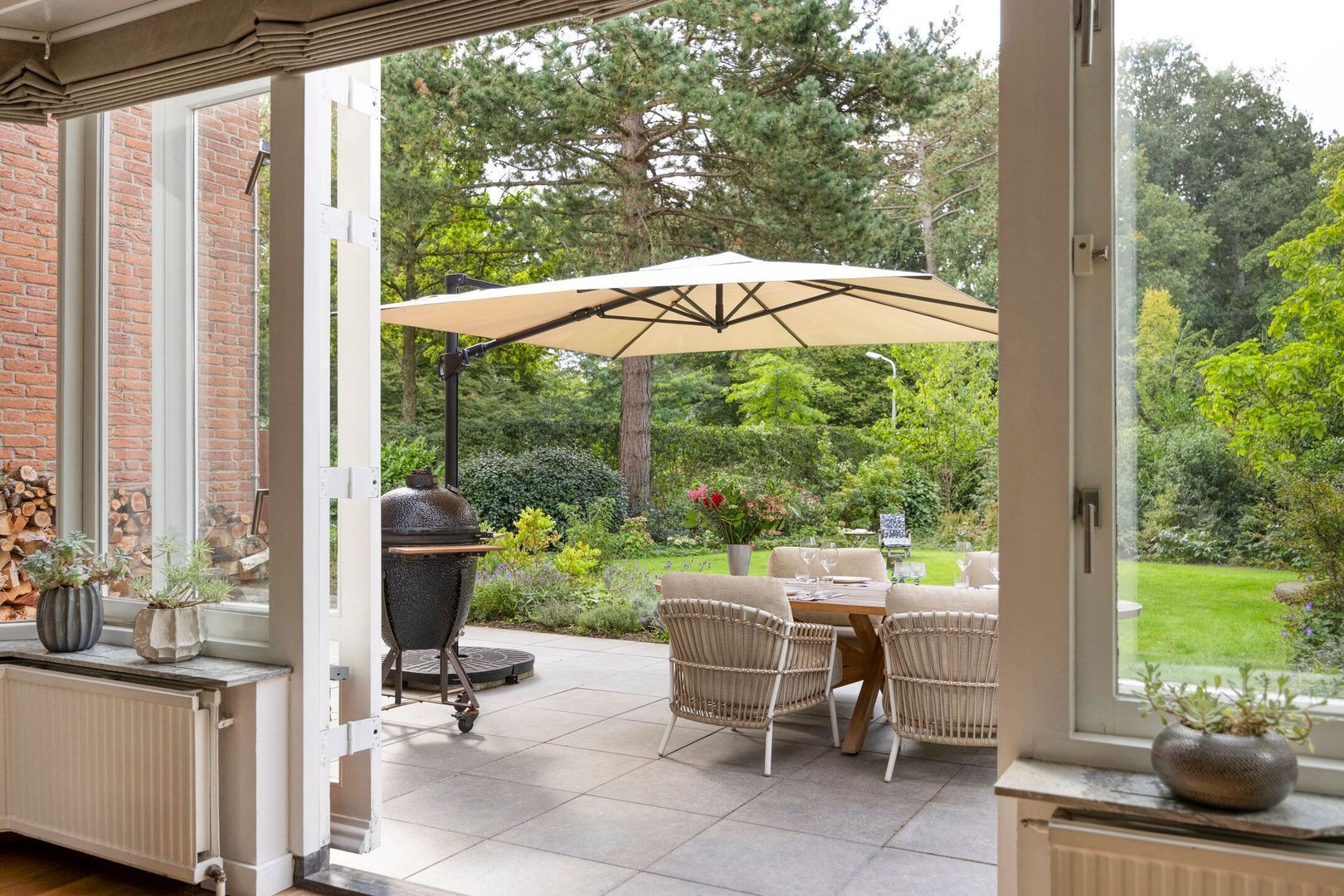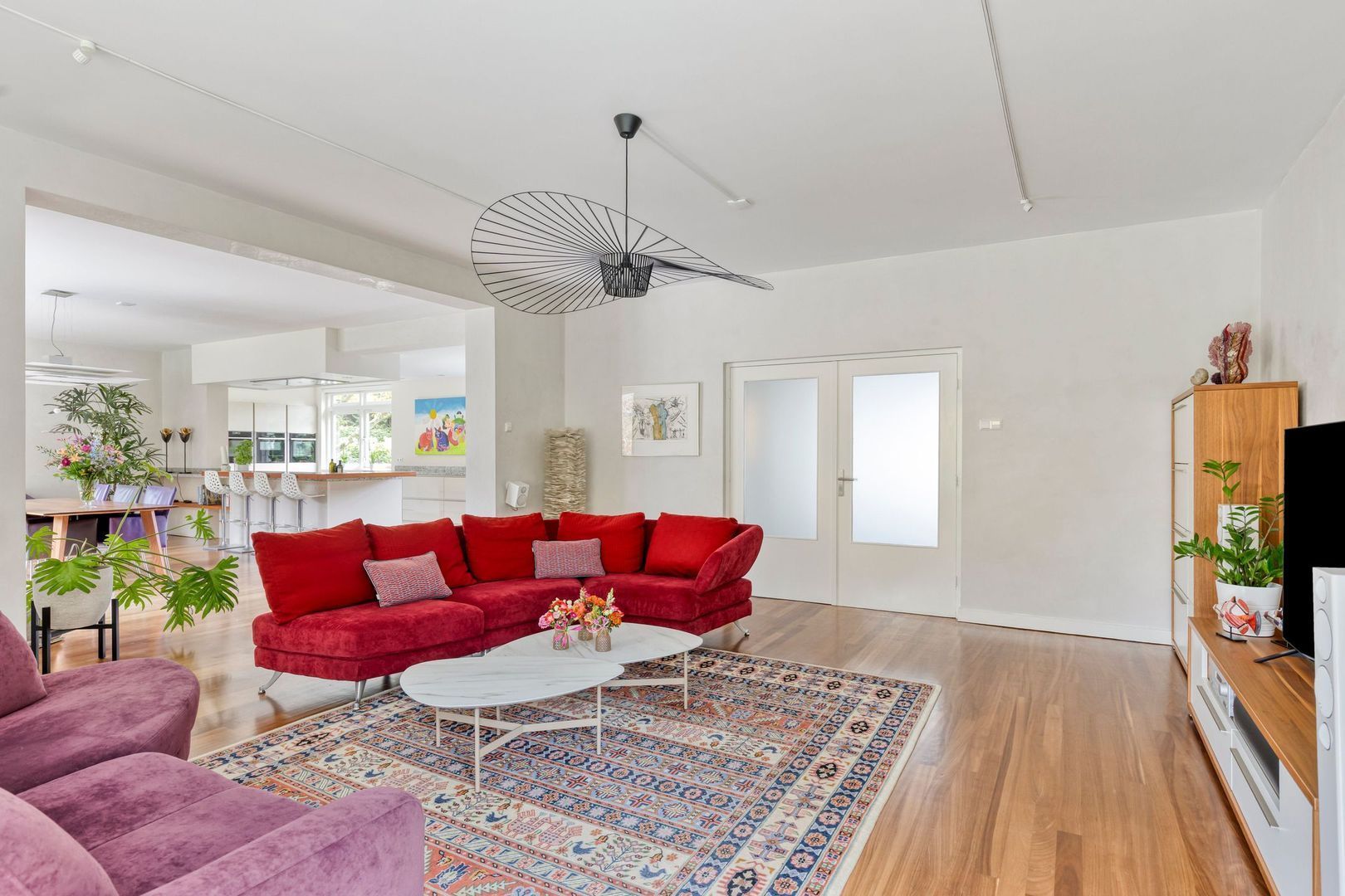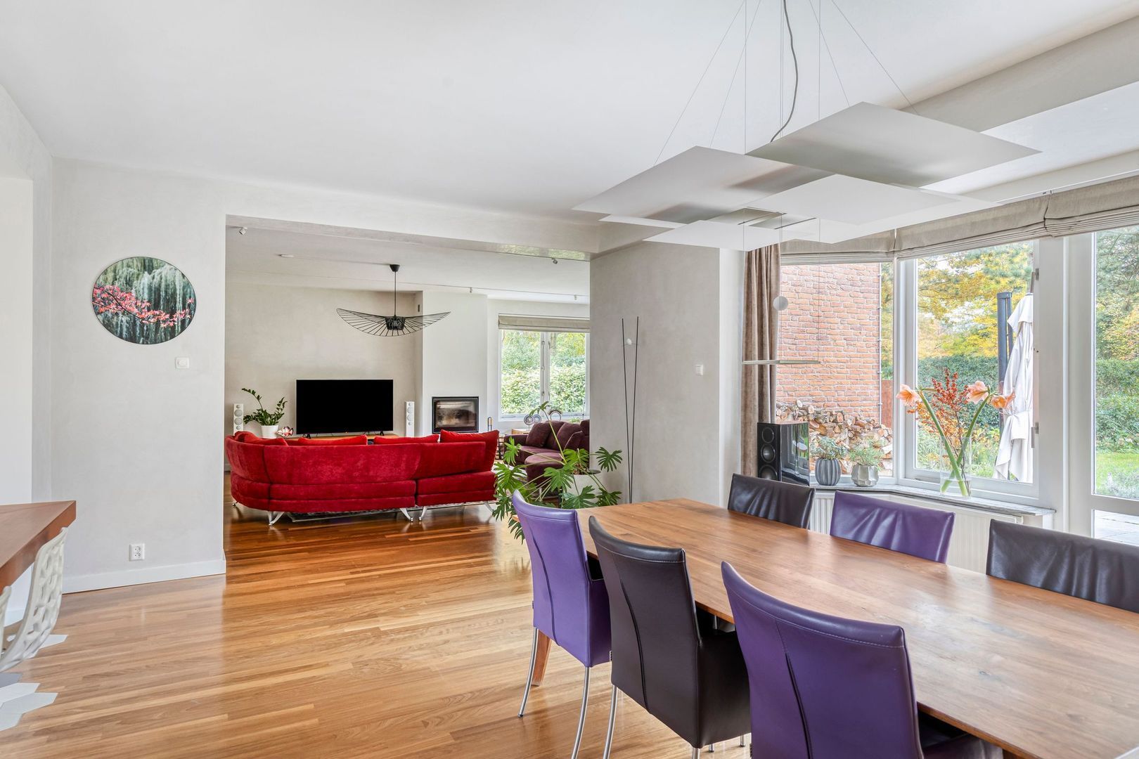 Royale woonkamer met zitgedeelte, gezellige houthaard in open verbinding en doorkijk met de woonkeuken. Zicht op tuin en terrassen vanuit de erker.