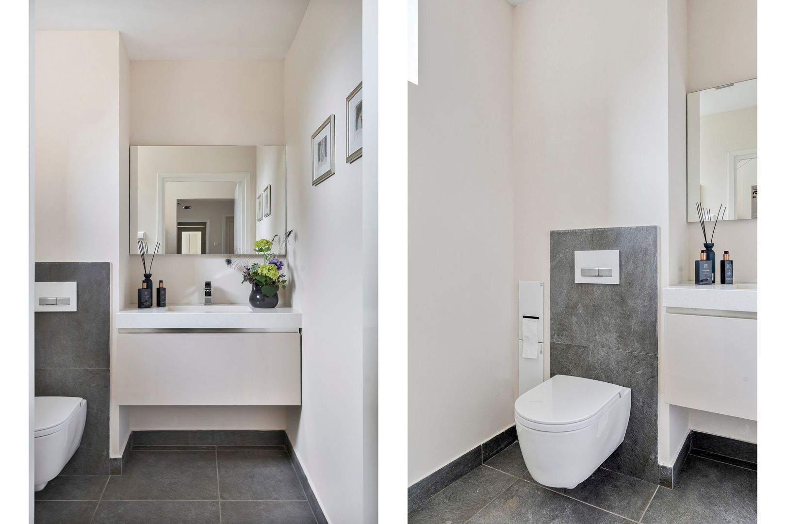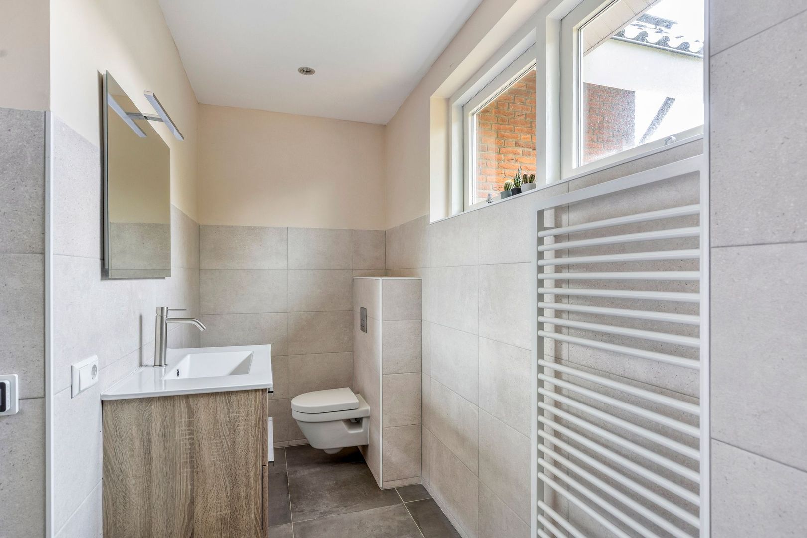 Doorgang naar tweede garderobe en groot gastentoilet met wastafelmeubel, radiator en raamlicht.