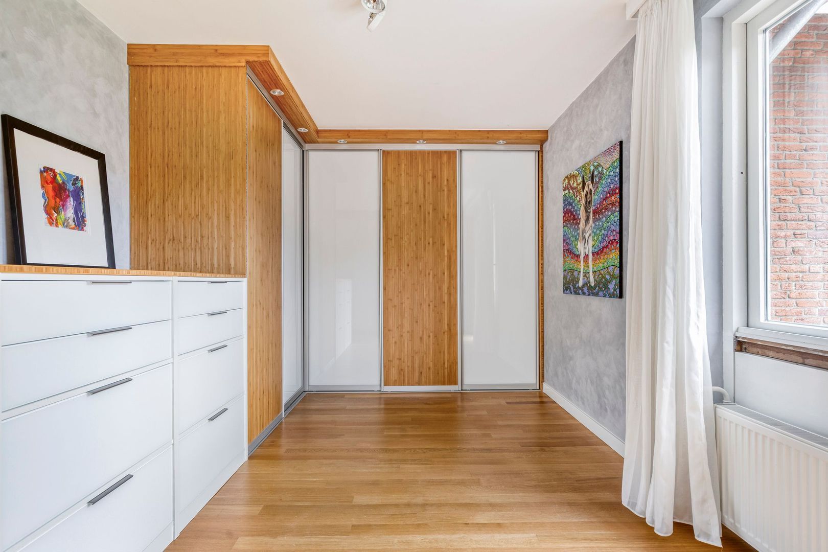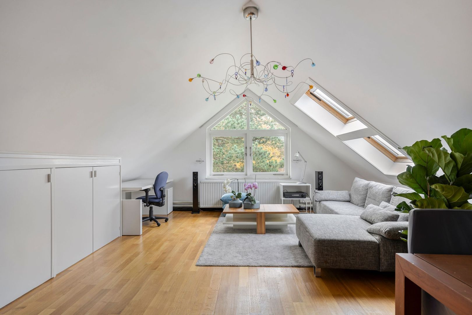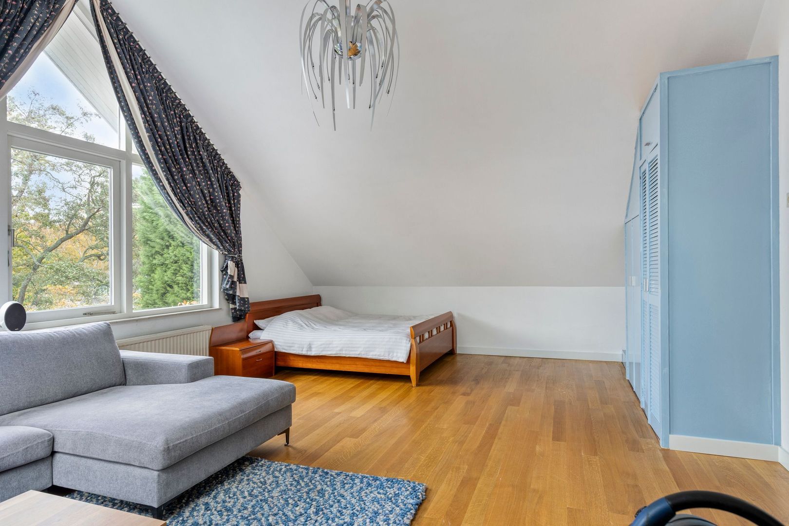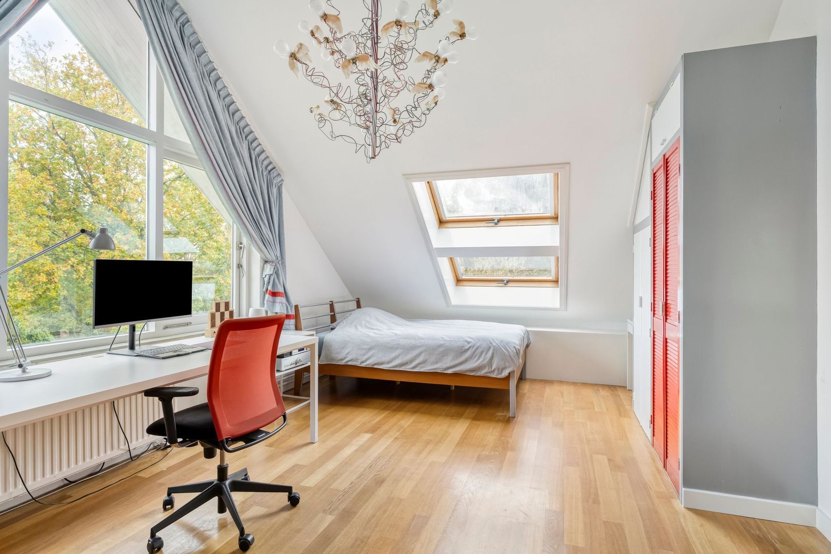 Zolderkamer 2: grote slaapkamer, vaste kasten en 2 Velux dakramen, zicht op tuin.