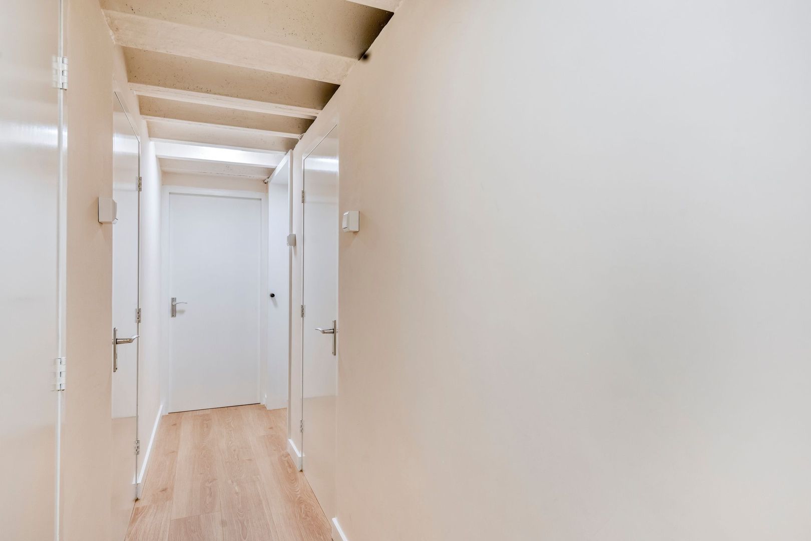Overloop met parketvloer (ca. 18 m²), daglicht en openslaande deuren naar balkon.