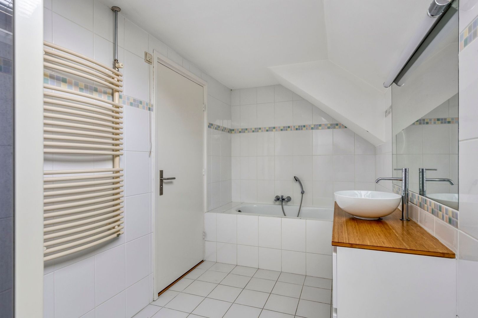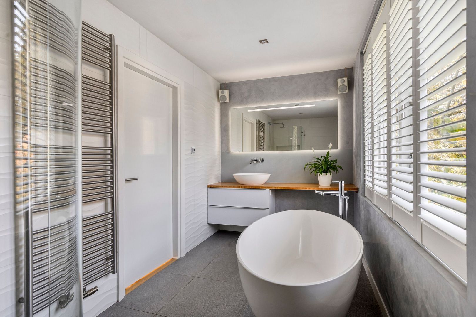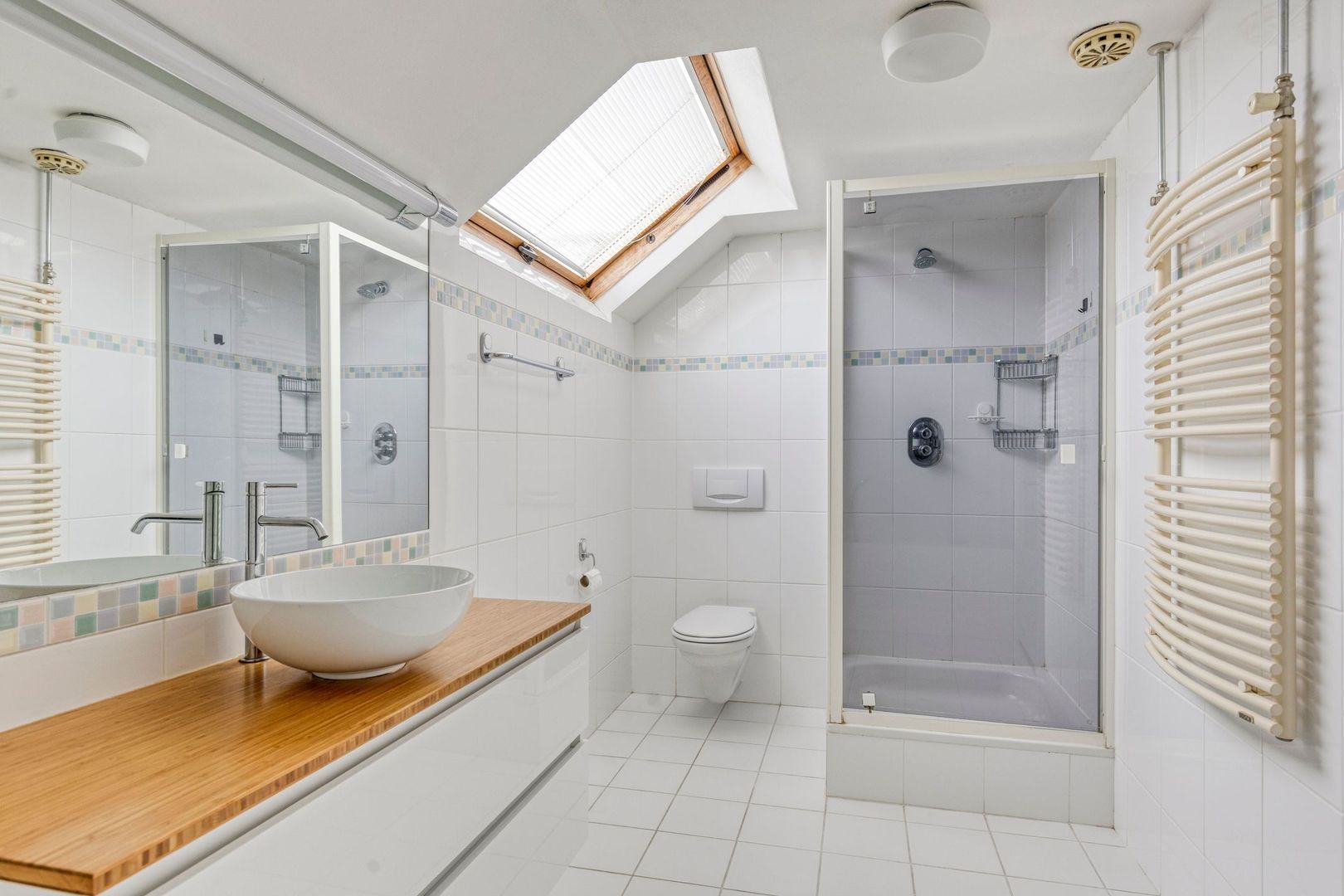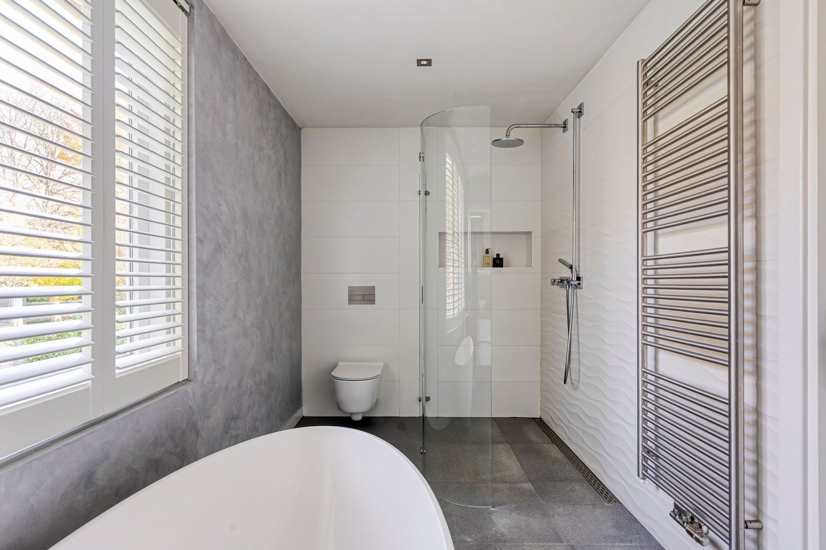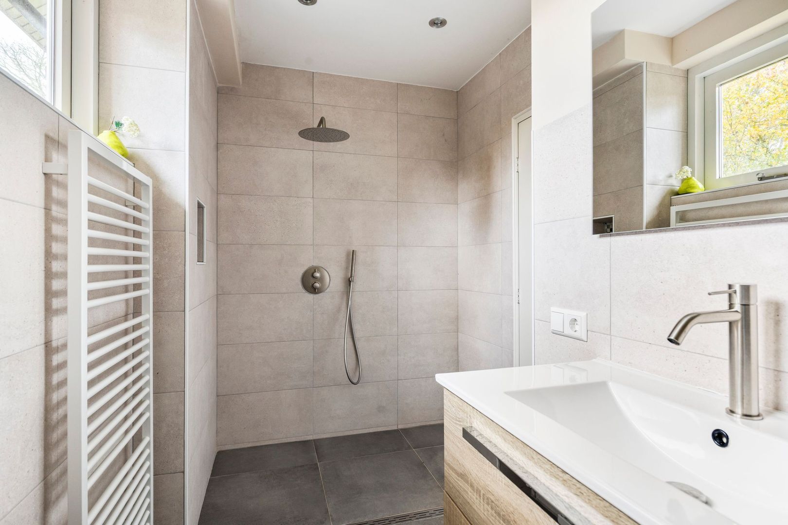 Badkamer met toilet, wastafel, inloopdouche en handdoekradiator tevens bereikbaar vanuit de naastgelegen kamer.