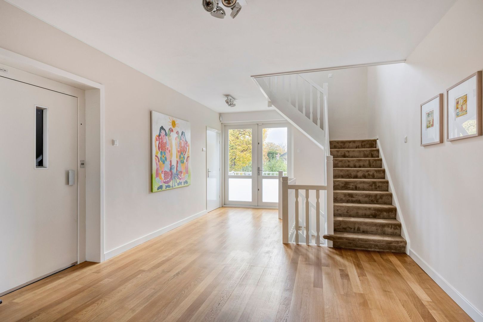 Centraal open trappenhuis met deur naar lift welke de kelder en de eerste verdieping bereikt.