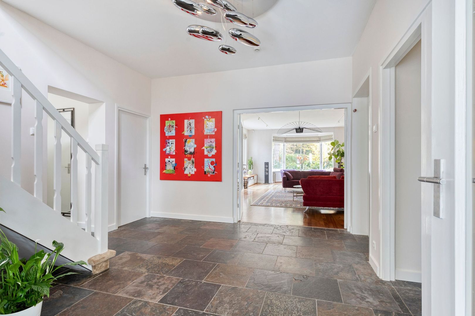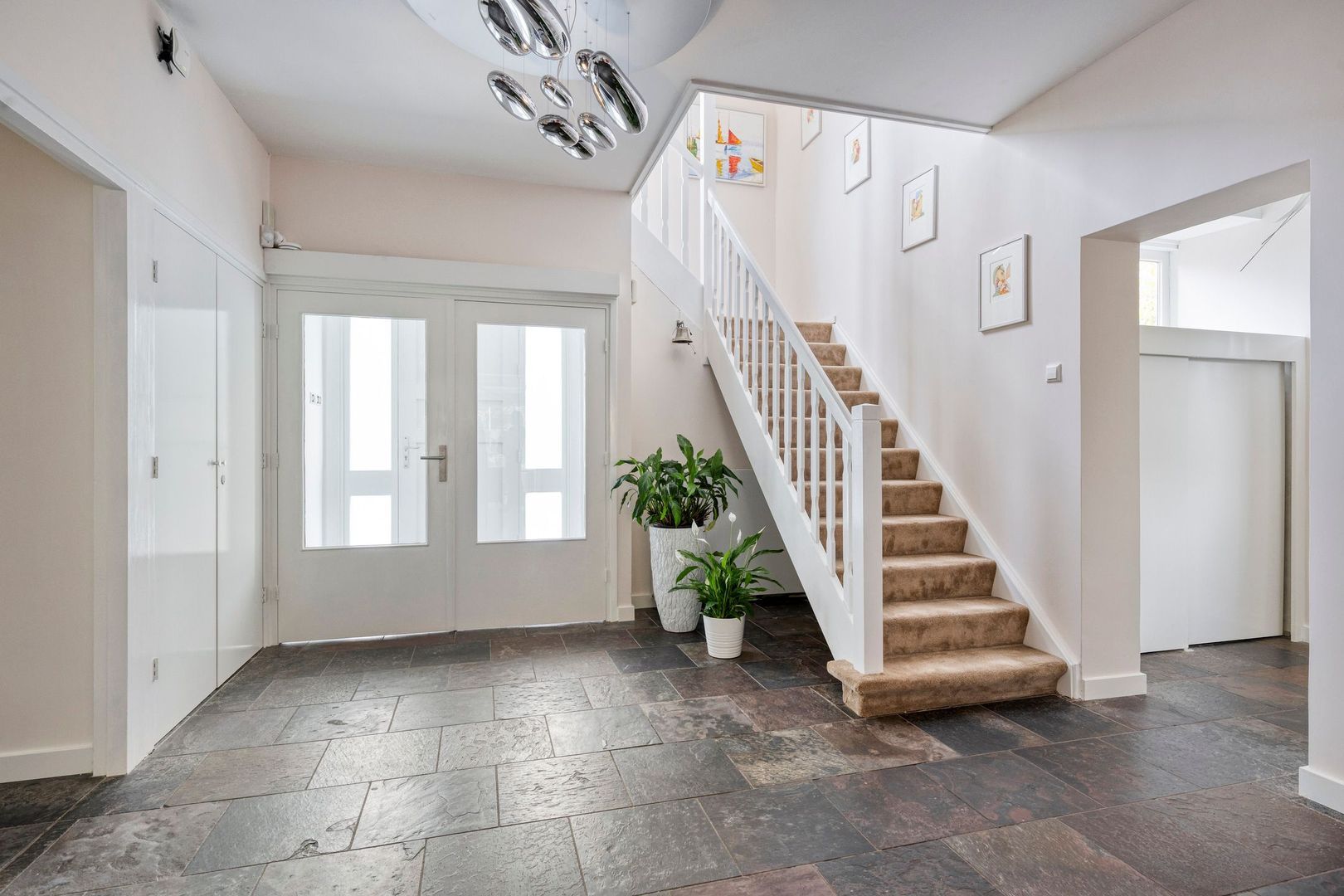 Portaal met garderobe in inbouwkast en dubbele deuren naar de centrale hal voorzien van een leistenen vloer.