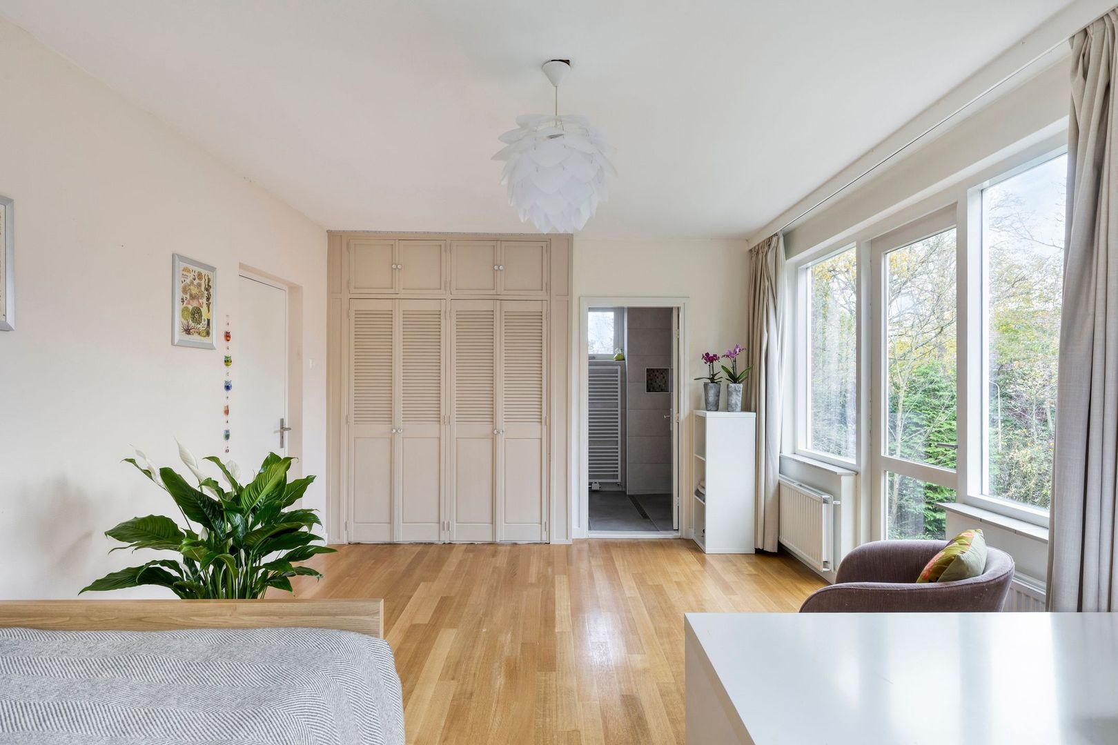 Slaapkamer 1: zicht op tuin, badkamer en suite (toilet, wastafel, regendouche), met openslaande deur naar balkon.