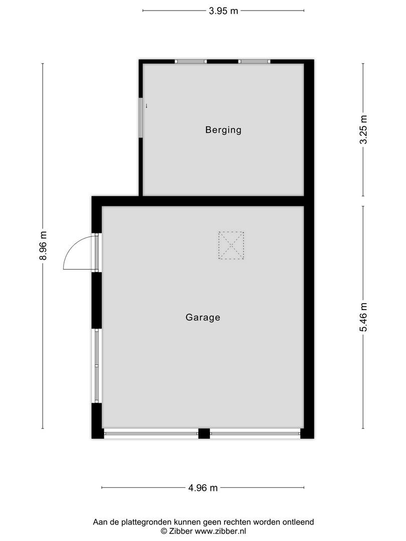 Dubbele stenen garage met tegelvloer, wandrekken en houten aanbouw ten behoeve van fietsen en tuingereedschap.