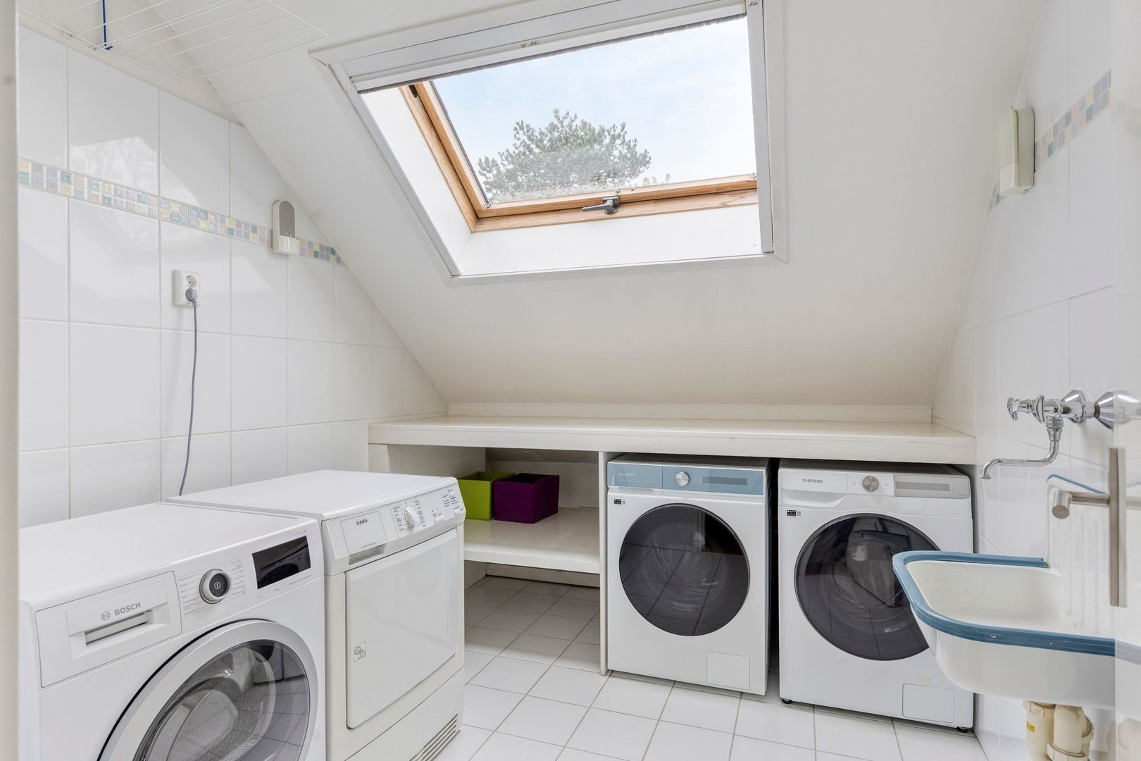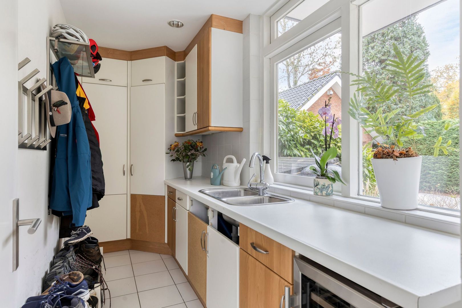Aparte bijkeuken met bergkasten, wijnklimaatkast en aanrechtblad, gootsteen met kraan, en vanuit de keuken tevens een achterom naar parkeerterrein/garage.